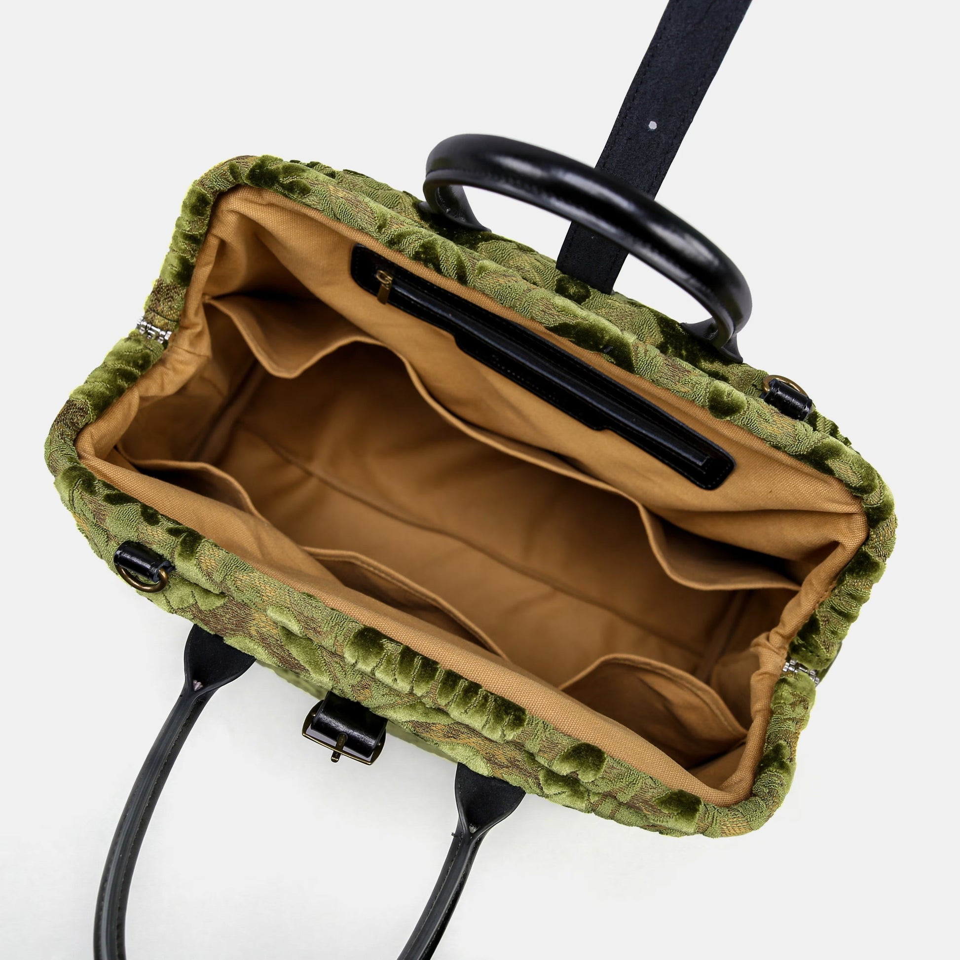 Crafted in a lush baroque-inspired velvet fabric, this bag brings a regal touch to your travel or everyday wardrobe. The deep green pattern catches the light with every movement, revealing a rich texture that speaks of refined taste.
